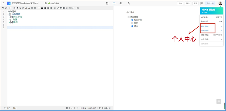 2. 在web端个人中心>我的文件(一级目录)下可查看全部类型文件。如果是在其它二级目录下,是无法查看Markdown文件的,需要切换到Markdown二级目录,才能查看所有的Markdown文件。